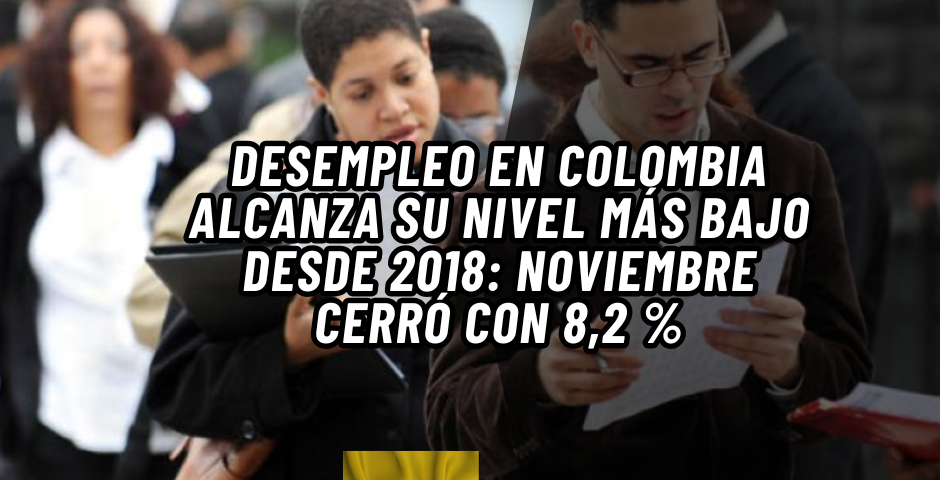 El Departamento Administrativo Nacional de Estadística (DANE) informó que la tasa de desempleo en Colombia durante noviembre de 2024 se ubicó en 8,2 %, una reducción significativa frente al 9 % registrado en noviembre de 2023.