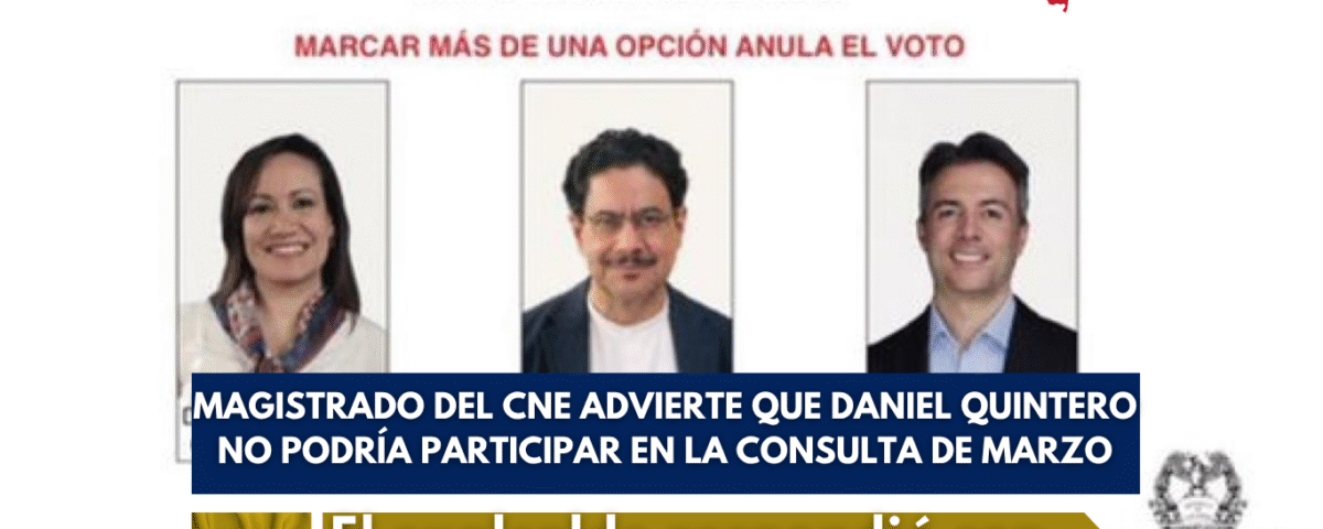 El magistrado del Consejo Nacional Electoral (CNE), Altus Baquero, advirtió que el exalcalde de Medellín, Daniel Quintero, no podría participar en la consulta presidencial prevista para marzo de 2026, luego de haber renunciado a la del Pacto Histórico programada para el próximo 26 de octubre. Según explicó, la ley prohíbe que una persona inscrita en una consulta pueda luego postularse a otra para el mismo cargo.