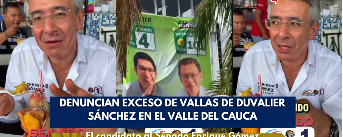 El candidato al Senado Enrique Gómez, cabeza de lista de Salvación Nacional, se comió un cholao en Jamundí y alertó sobre la gran cantidad de vallas del candidato Duvalier Sánchez en todo el Valle del Cauca, pese a que no ha reportado gastos de su campaña en el aplicativo de Datos Abiertos.