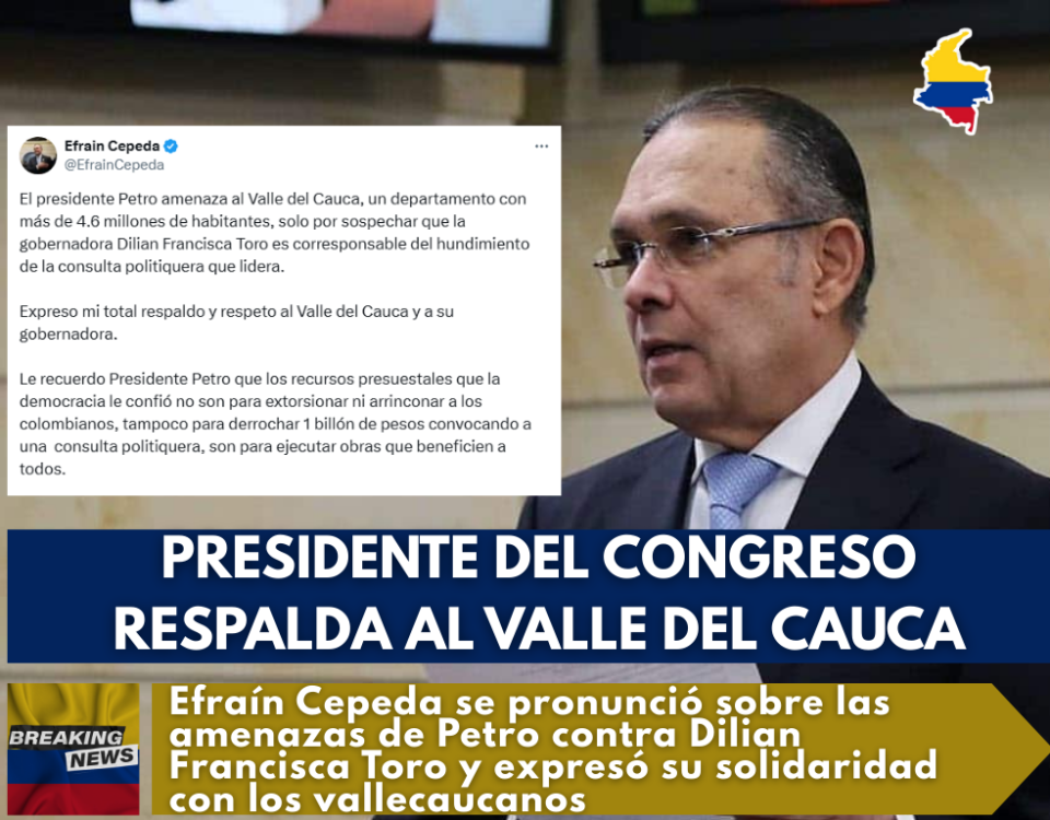 El presidente del Congreso, Efraín Cepeda, lanzó una dura advertencia al presidente Gustavo Petro tras sus recientes declaraciones contra la gobernadora del Valle del Cauca, Dilian Francisca Toro, a quien el jefe de Estado señaló como responsable de haber influido en el hundimiento de la consulta popular promovida por el Gobierno en el Senado.